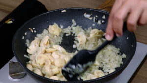 - Agora vou adicionar os cogumelos e vou refogar bem esses ingredientes.
