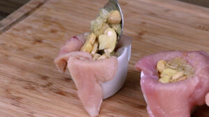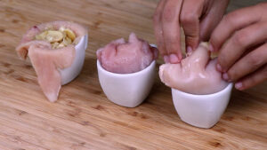 - Agora vou adicionar esse frango em uma xícara e vou fazer um espaço no meio para o recheio.