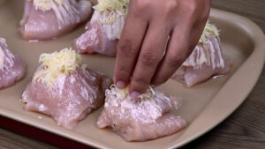 - Agora vou pincelar manteiga por cima do frango. E vou adicionar também queijo muçarela ralado. Por fim vou levar ao forno pré-aquecido a 180 graus por 25 minutos.