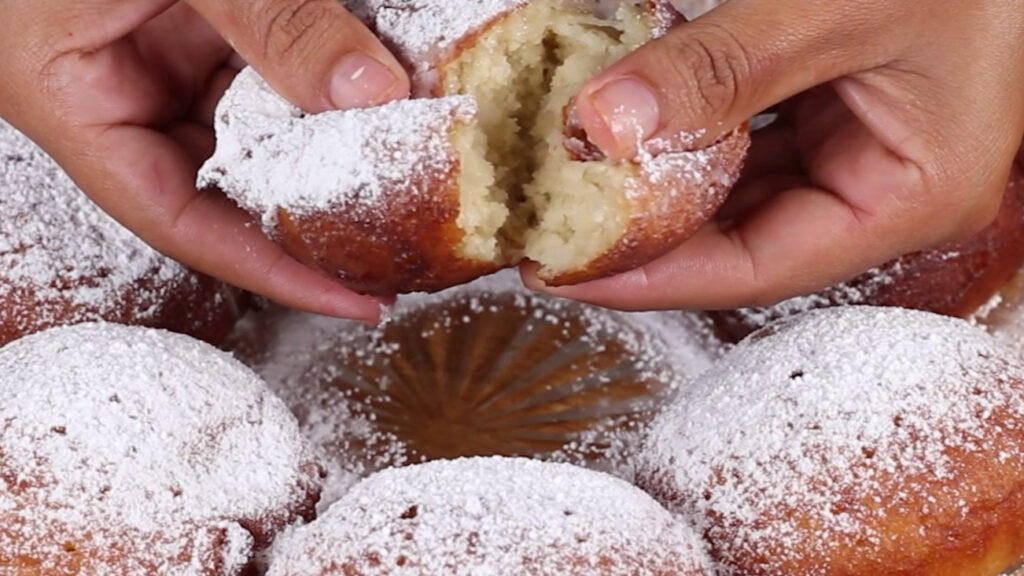 • Para continuar em uma frigideira vou adicionar óleo até a metade e deixar esquentar. Em seguida com uma concha vou pegar um pouco de óleo e coma outra concha vou despejar um pouco da nossa massa. Agora com uma colher de sopa vou despejar óleo quente sobre o bolinho até que fique completamente dourado.