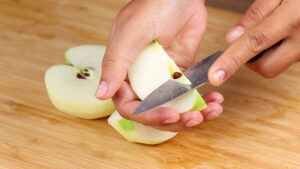• Para a nossa receita nós vamos precisar de 2 maçãs, vou descascar e depois e cortar em quatro partes retirando as sementes.