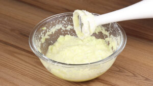 • Em uma tigela vou adicionar as maçãs que cortamos, 1 ovo, 40 g de açúcar e com ajuda de um triturador de alimentos vou triturar bem.