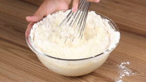 • E por fim vou adicionar 330 g de farinha de trigo e misturar bem.