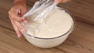 • Agora vou cobrir com papel filme e deixar fermentar por 30 minutos. Após esse tempo vou retirar o papel filme e misturar bem toda a massa.