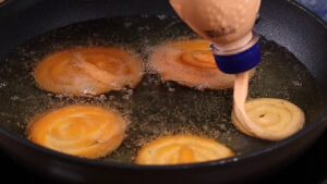 - Para continuar em uma panela vou adicionar óleo, e quando esse óleo estiver quente vou fazer vários bolinhos com a massa que colocamos na garrafa.