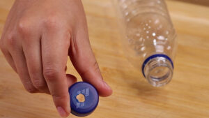 - Para essa receita nós vamos precisar de 1 garrafa vazia, irei retirar a tampa e com uma faca quente irei fazer um pequeno furo no meio dessa tampa. Reservarei essa garrafa aqui ao lado.