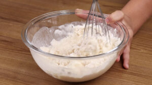 - Agora em uma tigela vou adicionar 150 g de farinha de trigo, ½ colher de chá de fermento em pó, 4 colheres de sopa de iogurte natural, 4 colheres de sopa de amido de milho, 150 ml de água e vou misturar bem esses ingredientes.