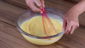 - Para começar em uma tigela vou adicionar 5 ovos, 225 gramas de açúcar, 270 ml de leite, e vou misturar bem esses ingredientes.