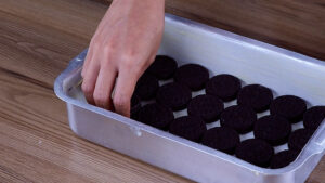 - Para continuar em uma fôrma untada com manteiga e farinha de trigo vou adicionar 300 gramas de biscoito Oreo. Você também pode usar qualquer outro biscoito de chocolate.
