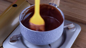 - Após isso em uma panela vou adicionar 200 gramas de chocolate, 200 gramas de creme de leite e vou mexer até que esses ingredientes se agreguem bem.