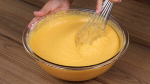 • Agora em uma tigela vou adicionar toda nossa mistura, vou adicionar também 3 xícaras de farinha de trigo passando por uma peneira e vou misturar bem.