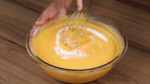 • Para continuar vou adicionar também 1 colher de sopa de fermento em pó e vou misturar delicadamente.