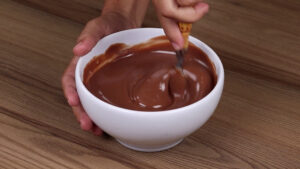 • Agora em uma tigela vou adicionar 200 gramas de creme de leite, 200 gramas de chocolate e vou misturar bem até que o chocolate se agregue ao creme de leite por completo.