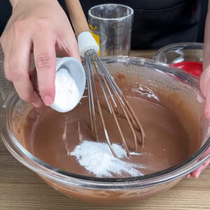 - Para começar, numa tigela vou adicionar 4 ovos, 1 xícara e meia de açúcar, 1 colher demanteiga e misturar. Em seguida, vou adicionar 2 xícara de farinha de trigo sem fermento, chocolate ou cacau em pó, mexer, depois acrescento água, vou misturar de novo, por fim adiciono fermento e misturo novamente.