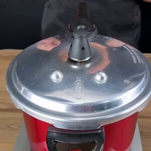 - Agora vou colocar toda a massa na panela de pressão, tampar e depois que pegar pressão vou contar e esperar 9 minutos com fogo bem baixo para não queimar.