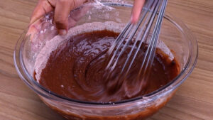 - Em seguida vou adicionar 1/2 xícara de chocolate em pó, 2 xícaras de farinha de trigo e vou misturar. Vou adicionar também 1 colher de sopa de fermento em pó e vou misturar novamente.