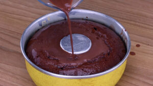 - Para continuar vou adicionar 200 gramas de chocolate derretido por cima do nosso bolo com ajuda de um saco de confeiteiro.