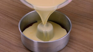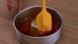 - Agora vou despejar essa mistura em uma fôrma e vou espalhar por todo esse recipiente.