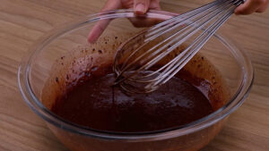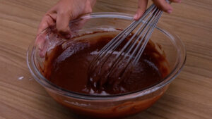 - Para continuar em um recipiente vou adicionar 2 ovos, 2/3 de uma xícara de açúcar, 2/3 de uma xícara de leite, 6 colheres de sopa de óleo, 6 colheres de sopa de chocolate em pó e vou misturar.