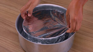 - Vou cobrir com papel alumínio e vou colocar em um recipiente maior. Em seguida vou colocar água até a metade do recipiente e vou levar ao forno a 180 graus por 1 hora e 30 minutos.