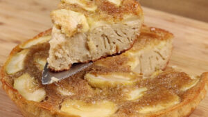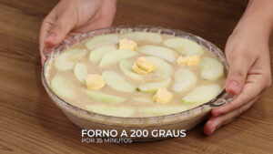 - Passarei toda a nossa massa para dentro de uma forma assadeira untada com margarina e polvilhada com farinha de trigo, e por cima da nossa massa vou adicionar 1 maçã cortada em fatias.