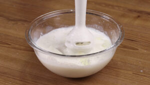 - Em uma tigela vou adicionar as nossas maçãs, 300 ml de leite e vou misturar bem esses ingredientes com um mixer.