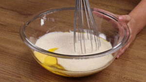 - Agora em outra tigela vou adicionar 3 ovos, 200 g de açúcar, 40 g de margarina, 1colher de chá de essência de baunilha e toda a nossa mistura que fizemos. Vou misturar todos esses ingredientes muito bem.
