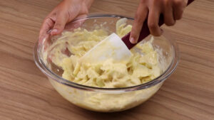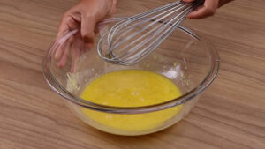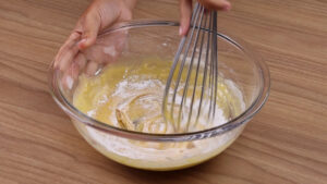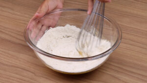 - Para continuar, vou adicionar na mistura que fizemos, 4 colheres de sopa de farinha de trigo passando por uma peneira e vou misturar bem.