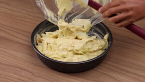 - E para finalizar vou despejar toda essa mistura dentro de uma forma untada com manteiga.