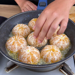 - Começando a nossa receita, numa frigideira com fogo desligado e com caramelo já preparado feito com 20 g de margarina e 20 g açúcar, vou adicionar 4 tangerinas cortadas ao meio.