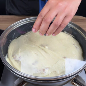 - Pra terminar, vou adicionar essa massa sobre as tangerinas e deixar cozinhar por 20 minutos tampado.