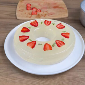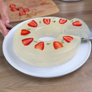 - Depois de gelado, retiro da forma e acrescento folhas e rodelas de morango.