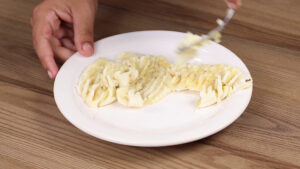 - Para começar vou descascar e amassar 1 banana com ajuda de um garfo.