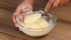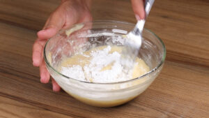 - Por último vou adicionar 1 colher de chá de fermento em pó e misturar novamente.