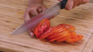 • Para a nossa receita nós vamos precisar de 1 tomate, cortarei esses tomates em rodelas.