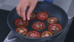 • Agora em uma frigideira em fogo baixo vou adicionar um pouco de azeite e espalhar bem. após isso vou adicionar todas as rodelas de tomate aqui dentro de forma organizada.