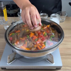 • Adiciono 1⁄2 colher de sal, 1⁄2 colher de pimenta do reino, 1 colher de páprica, 3 dentes de alho picados e cebola. Depois que refogar vou adicionar 1 cenoura ralada, 1 tomate picado, 1⁄2 pimentão picado, 2 colheres de molho de tomate, 200ml de água e deixar cozinhar por 5 minutos.