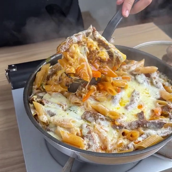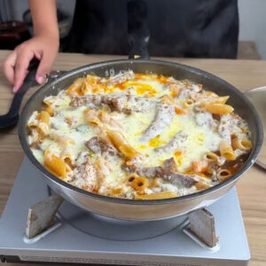 • Depois acrescento 200g de macarrão e mexo.