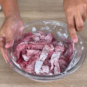 - Para começar, em uma tigela, vou adicionar a carne cortada e também o amido e em seguida misturar.