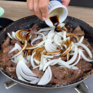- Agora em uma frigideira vou adicionar o óleo e o açúcar e misturar até formar o caramelo. A carne com amido é colocada na frigideira em seguida e continuamos a misturar tudo isso.