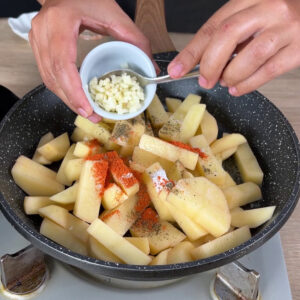 - Logo depois em outra frigideira vou adicionar o azeite e as batatas cortadas. Vou temperar com sal, pimenta moída, páprica, e 2 dentes de alho. Misturarei tudo isso e tamparei para deixar cozinhar por 20 minutos.