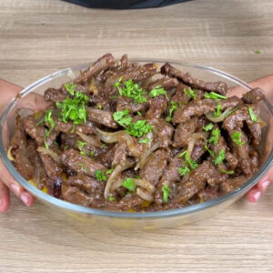- Em uma travessa vou adicionar as batatas fritas e por cima a nossa carne da frigideira. E a nossa receita ficou pronta! Agora é só colocar cheiro verde a gosto e servir para toda a família!