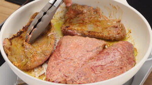 - Para continuar em uma frigideira vou adicionar 1 fio de azeite de oliva, a carne e vou deixar fritar. Quando um lado estiver pronto, vou virar para fritar o outro.