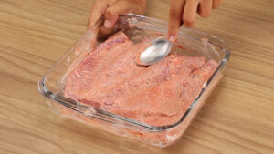 - Para esta receita, vou começar temperando 4 bifes com 1 colher de chá de sal, 1 colher de chá de páprica, 1/2 colher de chá de pimenta do reino, 1 colher de chá de orégano, 1 colher de sopa de maionese e vou espalhar por toda a carne.