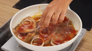 - Depois disso vou colocar algumas rodelas de cebolas, 4 colheres de sopa de molho de tomate e vou espalhar por todo o bife.