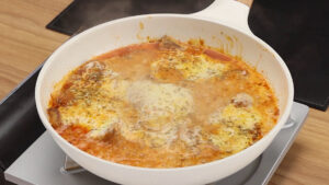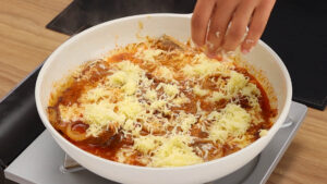 - Vou adicionar também 1/4 xícara de água, vou tampar e deixar cozinhar. Em seguida vou adicionar 100 gramas de queijos muçarela ralado. Esse queijo vai dar um sabor especial para a nossa receita. Agora vou tampar e deixar cozinhar até que o queijo se derreta por completo.