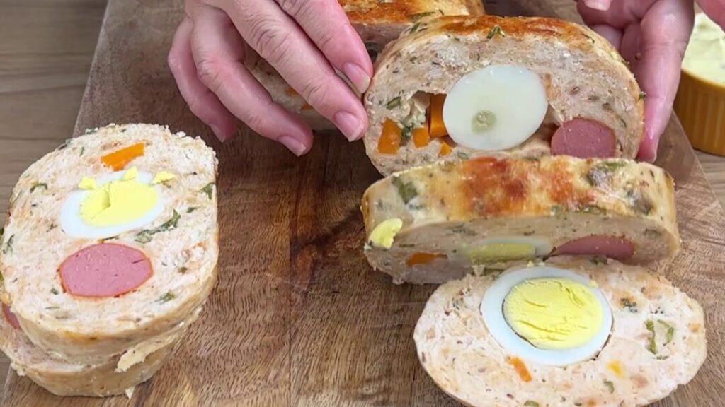 Prepare o rocambole de frango mais delicioso do mundo com esta receita fácil. Triture dois peitos de frango, misture com temperos, farinha de trigo e shoyu. Espalhe sobre papel filme, recheie com ovos cozidos, cenoura e salsicha. Enrole e cozinhe em água por 40 minutos. Depois, sele na frigideira com azeite. Sirva quente e aproveite essa delícia crocante por fora e macia por dentro.