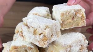 Esta receita apresenta um doce de amendoim cremoso, feito com leite condensado, leite em pó e manteiga. A mistura é cozida até atingir a consistência de brigadeiro, depois espalhada em uma forma e deixada para esfriar. O doce é finalizado com uma camada de leite em pó por cima, criando uma sobremesa deliciosa e fácil de fazer que é perfeita para qualquer ocasião.