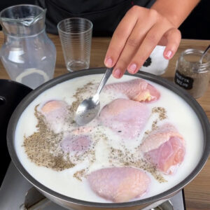 - Em uma frigideira, vou colocar as coxas de frango e por cima o leite, água, pimenta do reino e sal. Vou mexer e deixar cozinhar por 20 minutos.