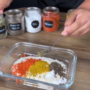 - Agora em uma travessa vou colocar farinha de trigo, farinha de rosca, açafrão, páprica, sal, pimenta do reino, orégano e misturar com um garfo. Reservarei.
